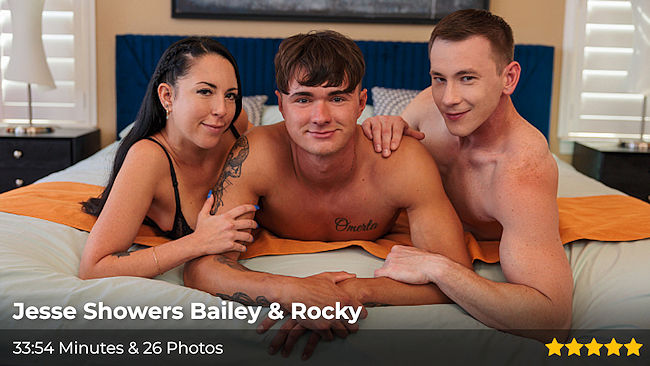 Rocky and Jesse first had a threesome with Bailey Vibes (twice) and Nickey Huntsman at Bi College Fucks.
